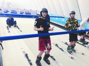 湖北体操队运动员、2013年全运会体操自由操金牌得主吴迪跨项选拔后在模拟滑雪机上进行滑雪训练。