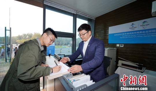 10月20日,北京2022年冬奥会和冬残奥会吉祥物全球征集进入交稿阶段。图为交稿处接待首位交稿人李泽一。北京冬奥组委供图