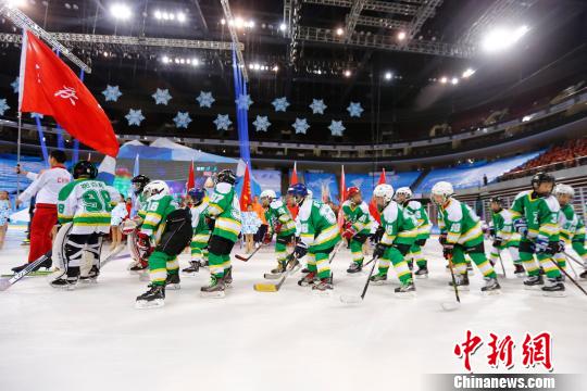 随后,来自海淀区和西城区的两支U15男子冰球队联袂呈现了一场表演赛,冰球小将们技艺精湛、对抗激烈,博得观众的阵阵掌声和欢呼。