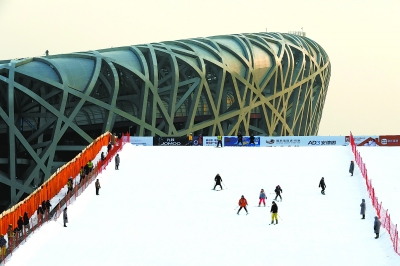 昨天,在奥林匹克公园,游客们在国家体育场鸟巢旁的雪场滑行而下,感受冬季运动的乐趣。当天,首届“相约2022”冰雪文化节活动在这里开幕。