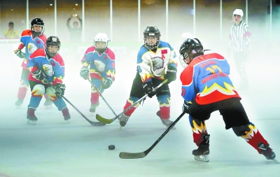 冬奥筹办带动北京市民冰雪运动热情,图为小朋友们在丰台区首家室内冰场上打冰球。
