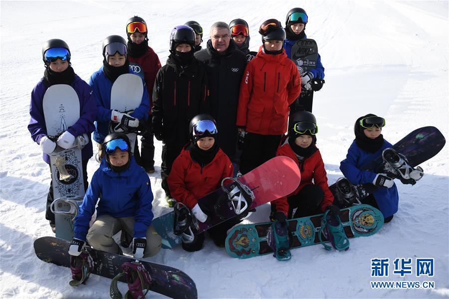 1月29日,国际奥委会主席巴赫(后右四)与在雪场滑雪的孩子们合影留念。 当日,国际奥委会主席巴赫来到河北省张家口市和北京市延庆区,考察2022年北京冬奥会筹办进展。 新华社记者张晨霖摄