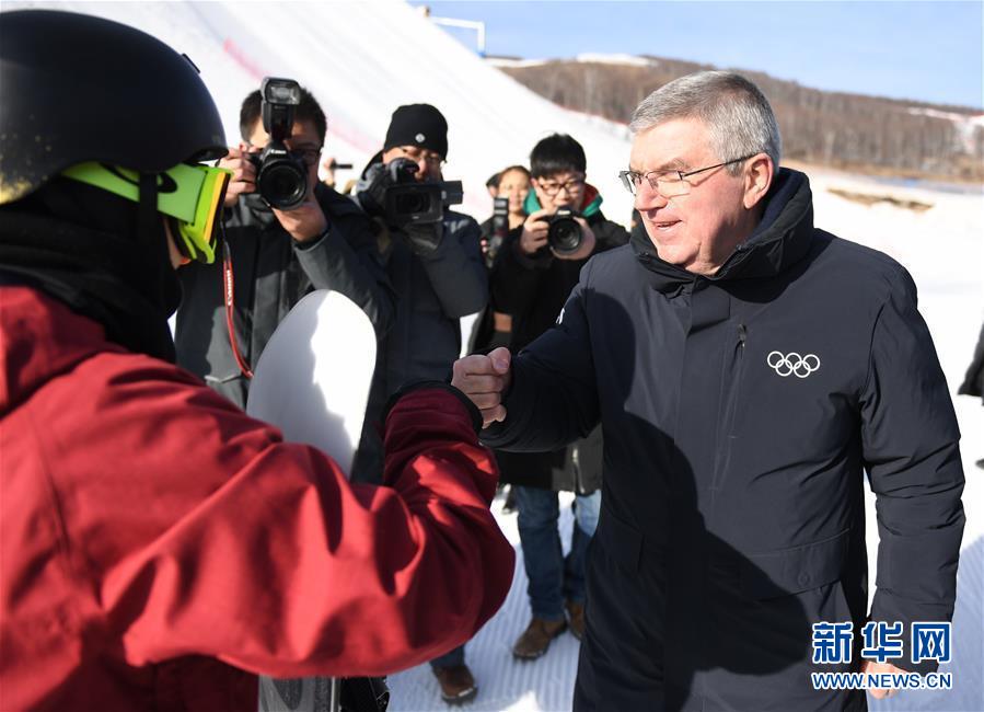 1月29日,国际奥委会主席巴赫(右)与在雪场滑雪的孩子碰拳。 当日,国际奥委会主席巴赫来到河北省张家口市和北京市延庆区,考察2022年北京冬奥会筹办进展。 新华社记者张晨霖摄