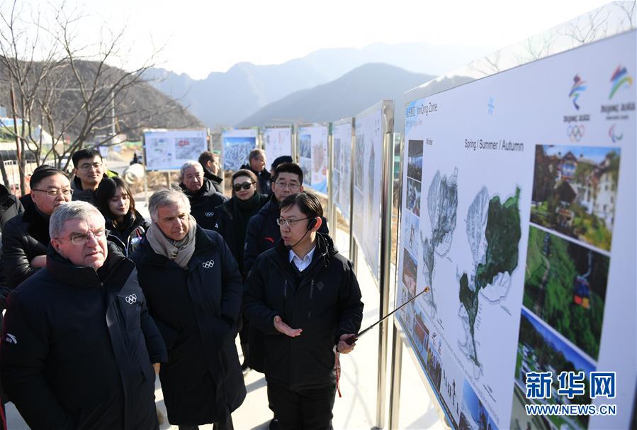 1月29日,国际奥委会主席巴赫(前左)在延庆赛区听工作人员讲解。 当日,国际奥委会主席巴赫来到河北省张家口市和北京市延庆区,考察2022年北京冬奥会筹办进展。 新华社记者张晨霖摄