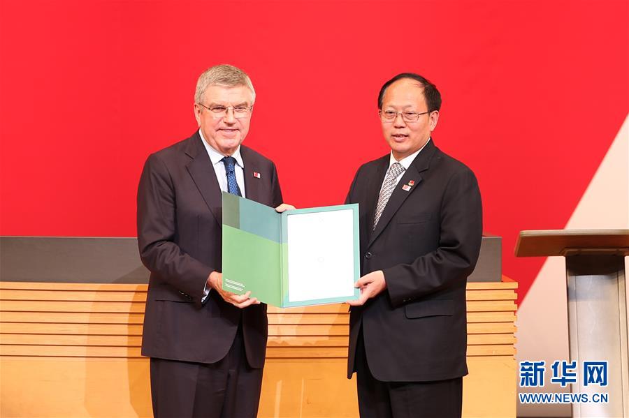 7月24日,国际奥委会主席巴赫(左)在仪式现场向中国奥委会主席苟仲文递交东京奥运会邀请函。 当日,2020年东京奥运会倒计时一周年庆祝仪式在日本东京举行。东京奥运会将于2020年7月24日至8月9日举行。 新华社记者杜潇逸摄
