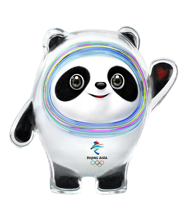 以熊猫为原型进行设计创作。将熊猫形象与富有超能量的冰晶外壳相结合,体现了冬季冰雪运动和现代科技特点。头部外壳造型取自冰雪运动头盔,装饰彩色光环,其灵感源自于北京冬奥会的国家速滑馆——“冰丝带”,流动的明亮色彩线条象征着冰雪运动的赛道和5G高科技;左手掌心的心形图案,代表着主办国对全世界朋友的热情欢迎。整体形象酷似航天员,寓意创造非凡、探索未来,体现了追求卓越、引领时代,以及面向未来的无限可能。