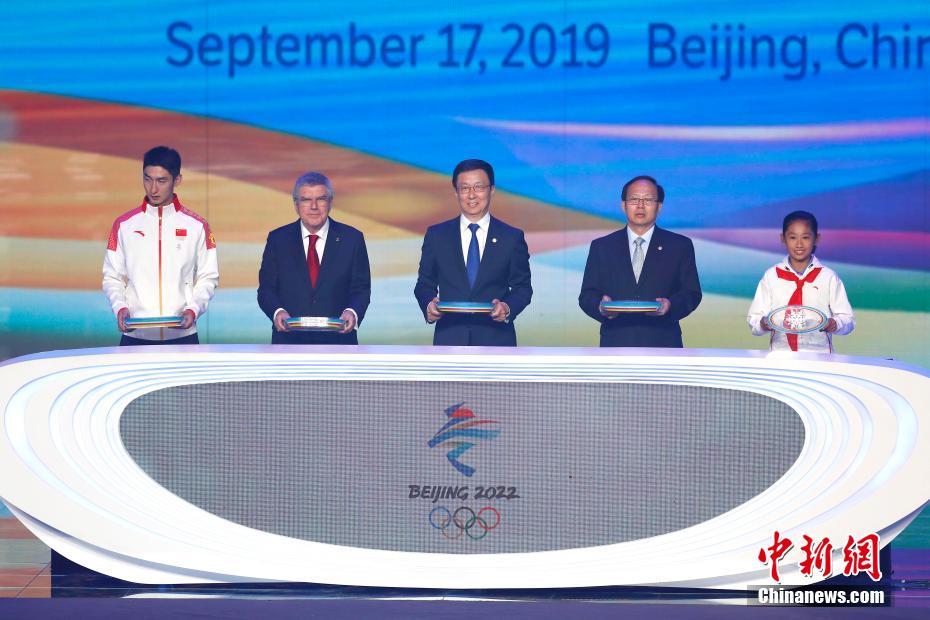 9月17日,北京2022年冬奥会吉祥物和冬残奥会吉祥物发布活动在北京举行。图为中共中央政治局常委、国务院副总理、第24届冬奥会工作领导小组组长韩正(中),国际奥委会主席托马斯·巴赫(左二),国家体育总局局长、北京冬奥组委执行主席苟仲文(右二),冬奥冠军武大靖(左一)及冰雪少年代表,一同开启装置,发布北京2022年冬奥会吉祥物。中新社记者 富田 摄