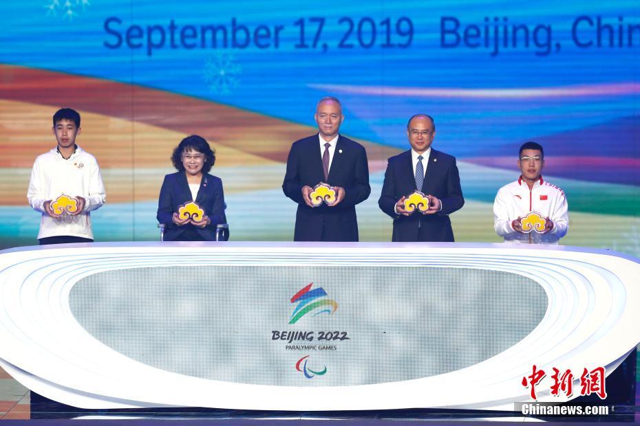9月17日,北京2022年冬奥会吉祥物和冬残奥会吉祥物发布活动在北京举行。图为中共中央政治局委员、北京市委书记、北京冬奥组委主席蔡奇(中),河北省省长、北京冬奥组委执行主席许勤(右二),中国残联主席、北京冬奥组委执行主席张海迪(左二),冬残奥冠军陈建新(右一)及冰雪少年代表发布北京2022年冬残奥会吉祥物。中新社记者 富田 摄