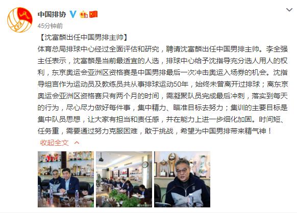 上海排球协会会长沈富麟担任中国男排主教练。图片来源:中国排协官方微博