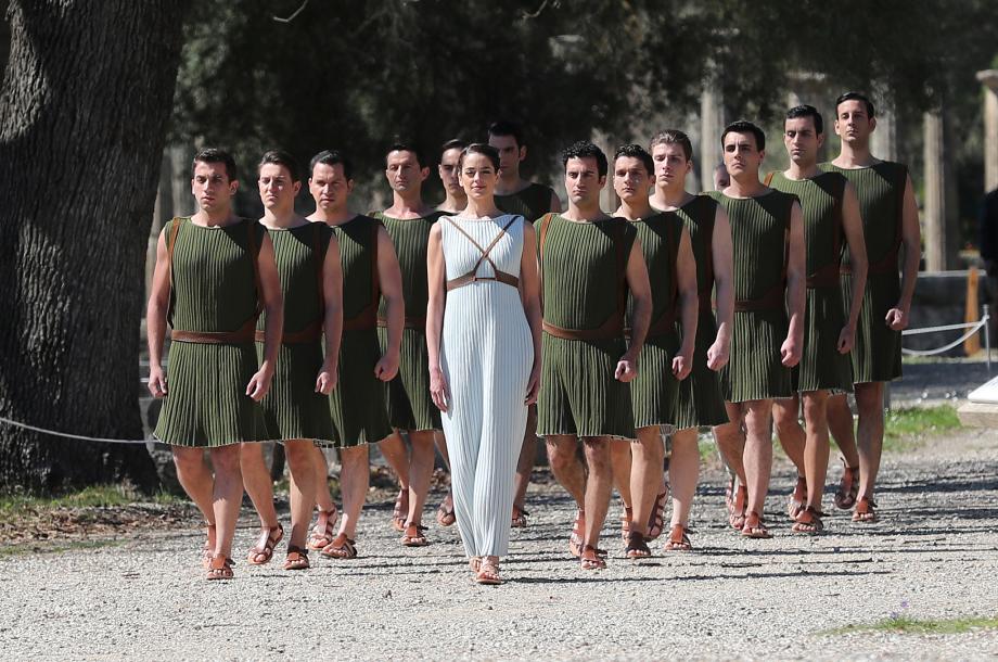 一名女祭司以三击鼓的方式拉开了圣火采集仪式的序幕。身穿浅蓝色的女祭司们缓缓入场,最终,伴随着鹅卵石击打的声音,最高女祭司缓缓步入场中。在凹面聚焦镜前,她呼唤太阳神阿波罗,随即将火炬缓缓伸向凹面镜,在阳光反射下聚焦,火炬瞬间被点燃。最高女祭司用火炬点燃圣火盆,留取火种。在三击鼓后,35名女祭司重新汇聚成行,手捧圣火盆,沿着石子路,穿过拱门到达古奥林匹克竞技场。