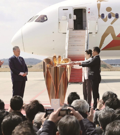 两天前,在希腊古奥林匹亚体育场引燃的奥运圣火乘专机抵达日本,受新冠肺炎疫情的影响,原来计划的盛大欢迎仪式变成了只有少数人参加的简短仪式。