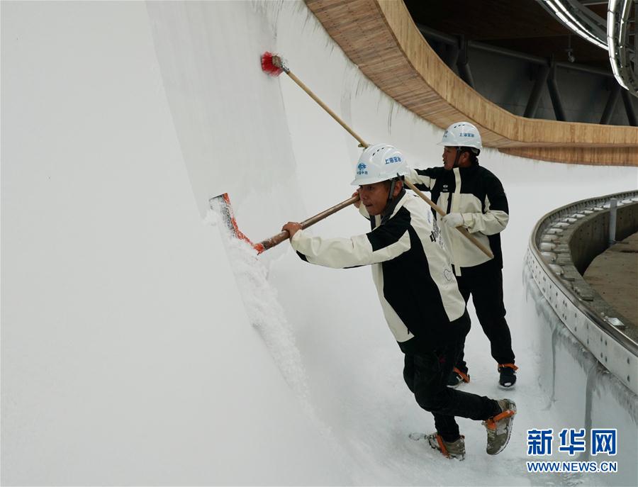 9月27日,工作人员正在国家雪车雪橇中心赛道上进行除霜作业。 当日,记者从北京市重大项目办获悉,北京冬奥会延庆赛区竞赛场馆国家雪车雪橇中心已于9月18日启动制冰,预计9月30日完成制冰,10月初迎接国家队入驻训练。 新华社记者 张晨霖 摄