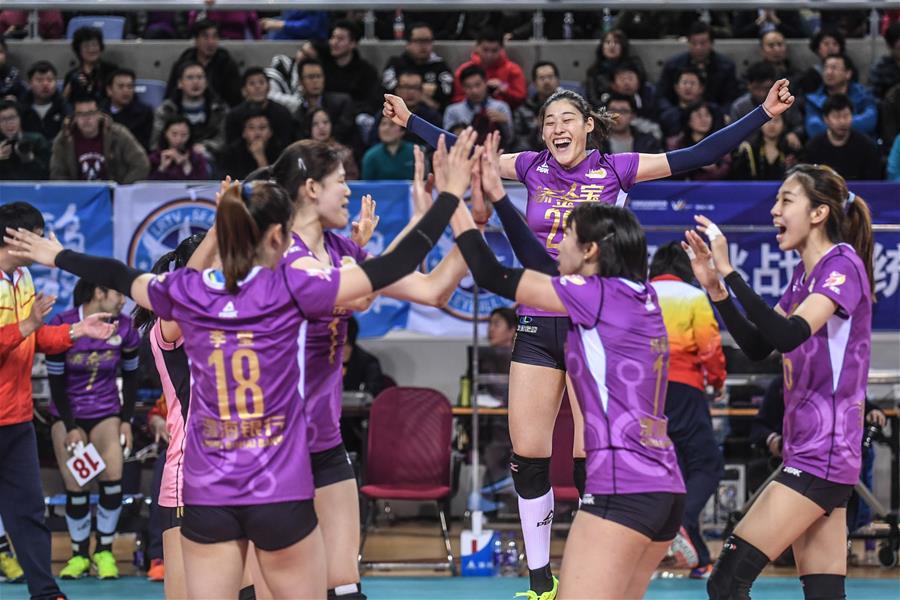 ↑2月10日,天津渤海银行队球员在获胜后庆祝。当日,在2017-2018赛季中国女子排球超级联赛半决赛首回合比赛中,辽宁三生制药沙鸥女排主场以1比3不敌天津渤海银行女排。新华社记者潘昱龙摄