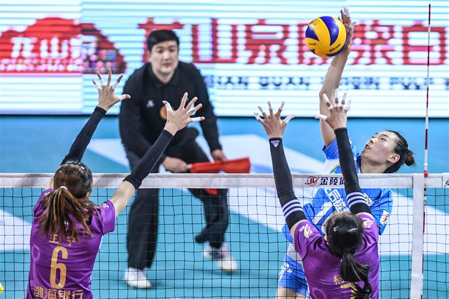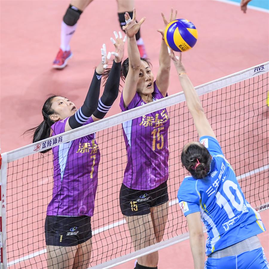 ↑2月10日,辽宁三生制药沙鸥队球员段放(右一)在比赛中扣球。当日,在2017-2018赛季中国女子排球超级联赛半决赛首回合比赛中,辽宁三生制药沙鸥女排主场以1比3不敌天津渤海银行女排。新华社记者潘昱龙摄