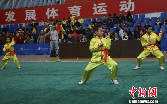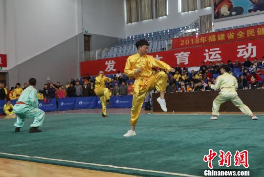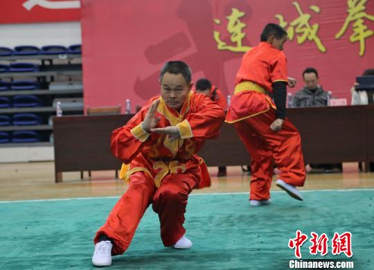 中新网连城2月27日电 (黄水林)27日,福建省连城县武术馆内热闹欢腾,2018年福建省全民健身运动会连城拳演武大会在此精彩上演。来自该县隔川、北团、莲峰、朋口、宣和、罗坊、文亨等乡(镇)村、中小学校、武术训练馆等32支代表队、260多名运动员共聚一堂、以武会友,充分展示连城传统武术的精萃和风采。