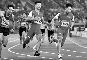 谢震业(中)与苏炳添(右)在比赛中。 中体在线 倪敏哲摄(资料图)