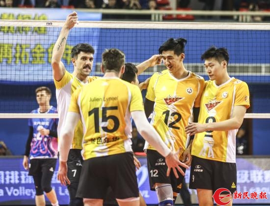 图说:上海男排庆祝胜利 新民晚报见习记者 李铭珅摄