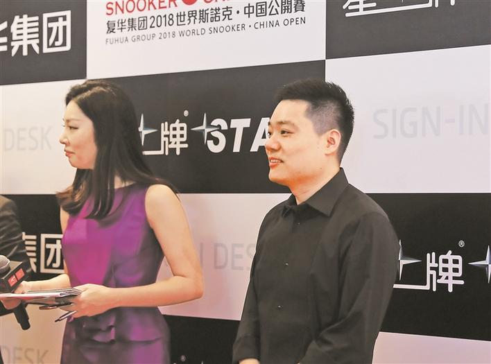 4月1日,2018世界斯诺克中国公开赛在北京开幕。本届赛事由世界职业斯诺克协会、中国台球协会、北京市体育局联合主办,正式比赛将于4月2日至8日在北京国家奥林匹克中心体育馆举行。图为丁俊晖(右)在红毯仪式上回答记者提问。