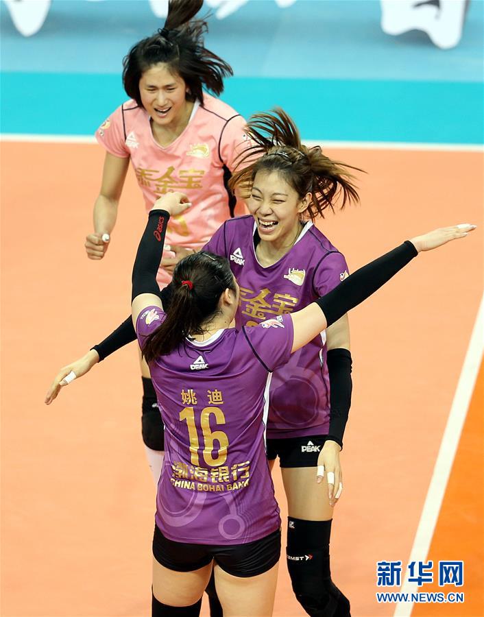 ↑4月3日,天津渤海银行队队员庆祝夺冠。当日,在2017-2018赛季中国女子排球超级联赛决赛第七场比赛中,天津渤海银行队客场以3比2战胜上海光明优倍队,以4比3的总比分夺得冠军。新华社记者凡军摄