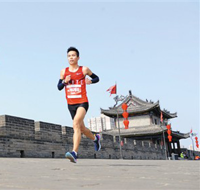 4月21日,2018西安城墙国际马拉松赛在西安明城墙永宁门鸣枪开跑。张博文摄(新华社发)