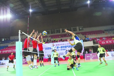 本次比赛被誉为近年来国内级别和水准最高的气排球赛事,受到全国气排球爱好者的高度关注,吸引了来自全国20多个省区市级以上俱乐部的54支代表队、近千人参加。长泰县气排球队勇于拼搏、团结协作,击败了包括2017年全运会群众比赛气排球项目男子组冠军浙江队在内的诸多强敌,问鼎冠军。题图:长泰队在比赛中拦网。
