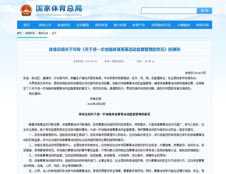 2017年11月8日,国家体育总局先后在官网发布《关于进一步加强马拉松赛事监督管理的意见》《关于进一步加强武术赛事活动监督管理的意见》,明确提出要规范马拉松、武术等赛事活动,整治马拉松、武术乱象,推进马拉松、武术运动持续健康发展。此次再次发文强调加强体育赛事活动监管,无疑进一步表明总局在“放管服”的同时,也将严格履行自身监督管理,推动赛事规范发展的责任。