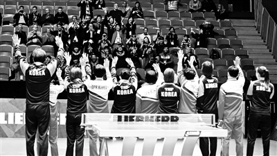 本报讯(记者 肖赧)第54届世乒赛团体赛淘汰赛昨天继续在瑞典哈尔姆斯塔德举行。在女团1/4决赛朝鲜队与韩国队的比赛开始前,刚刚入场的两队队员突然握手并合影留念,随后两队宣布将联合组队参加半决赛比赛。据了解,两队“联手”也被国际乒联予以认可。
