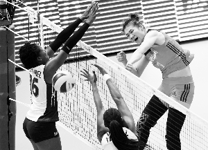 中国女排队员杨方旭(右)在比赛中扣球。 新华社记者 黄宗治摄