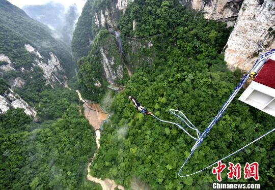 中新网张家界5月26日电 (邓霞 罗克文)5月26日,一群来自俄罗斯、澳大利亚、英国等国家的蹦极高手齐聚湖南张家界大峡谷玻璃桥,挑战花式蹦极。该蹦极平台位于玻璃桥中央,平台距离谷底垂直高度达260米,超过了“世界最高商业蹦极跳设施”吉尼斯纪录——233米的澳门旅游塔。
