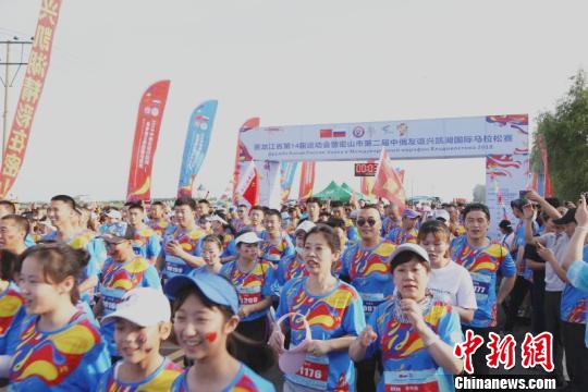 中新网密山7月15日电(朱越范士友王妮娜)15日,中俄两国唯一“跨越界湖”的马拉松比赛在中俄最大界湖兴凯湖所在的密山市开赛,来自全球各地的2256名选手参加了比赛。