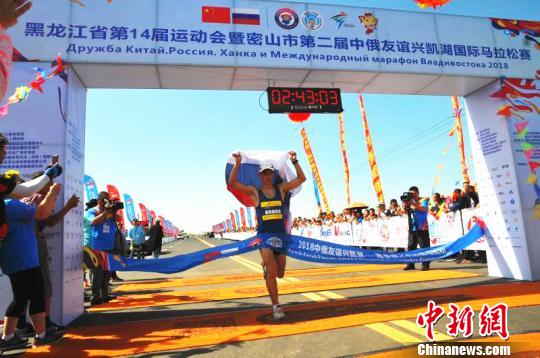 俄罗斯伊萨耶夫·罗马以2小时43分2秒的成绩获得男子组全程马拉松赛冠军 华子宾 摄