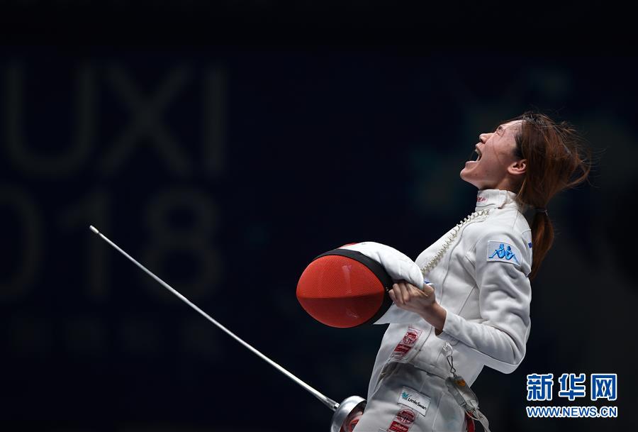 ↑ 7月25日,中国队选手朱明叶在获胜后庆祝。 当日,在江苏省无锡市举行的2018世界击剑锦标赛女子重剑团体赛季军争夺赛中,中国队以45比42战胜俄罗斯队,夺得铜牌。 新华社记者韩瑜庆摄