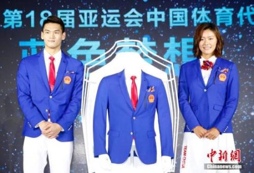 备战印尼2018年第18届亚运会的中国队游泳运动员徐嘉余(左)、刘湘身着新款礼服亮相。中新社记者 韩海丹 摄