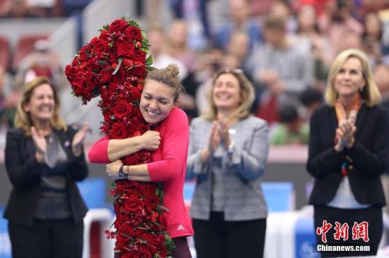 资料图:女子网球单打选手哈勒普(前)手捧数字“1”的花束。中新社记者 韩海丹 摄