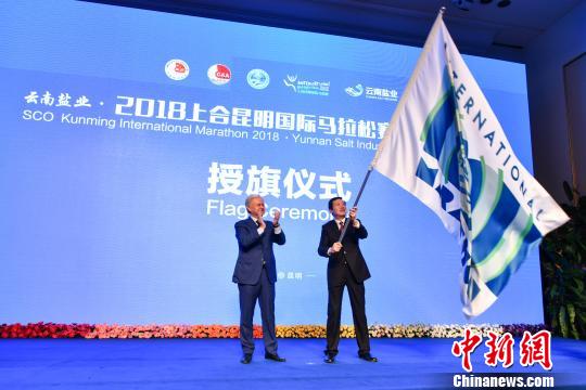 上海合作组织秘书长阿利莫夫(左)向昆明市长王喜良(右)授予马拉松会旗。 任东 摄
