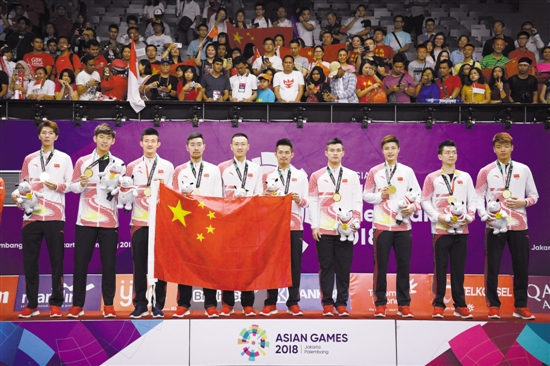 羊城晚报雅加达讯 特派记者魏超然报道:昨晚在亚运会羽毛球男团决赛赛场,中国队在观众鼎沸的声浪中以3比1力克东道主印尼队,重夺男团冠军。