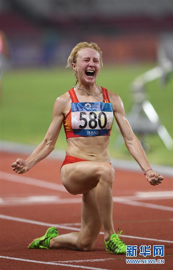 8月25日,吉尔吉斯斯坦选手马什洛娃在比赛后庆祝。 当日,在第18届亚运会女子10000米比赛中,吉尔吉斯斯坦选手马什洛娃以32分07秒23的成绩夺冠。 新华社记者潘昱龙摄