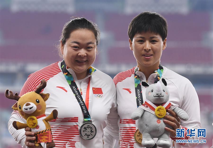 8月25日,中国选手罗娜(右)、王峥在颁奖仪式上。 当日,在第18届亚运会田径女子链球决赛中,中国选手罗娜以71米42的成绩夺冠,中国选手王峥以70米86的成绩获得亚军。 新华社记者潘昱龙摄