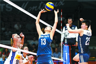 刁琳宇和胡铭媛(右一)在比赛中组织快攻。 国际排联官网/图