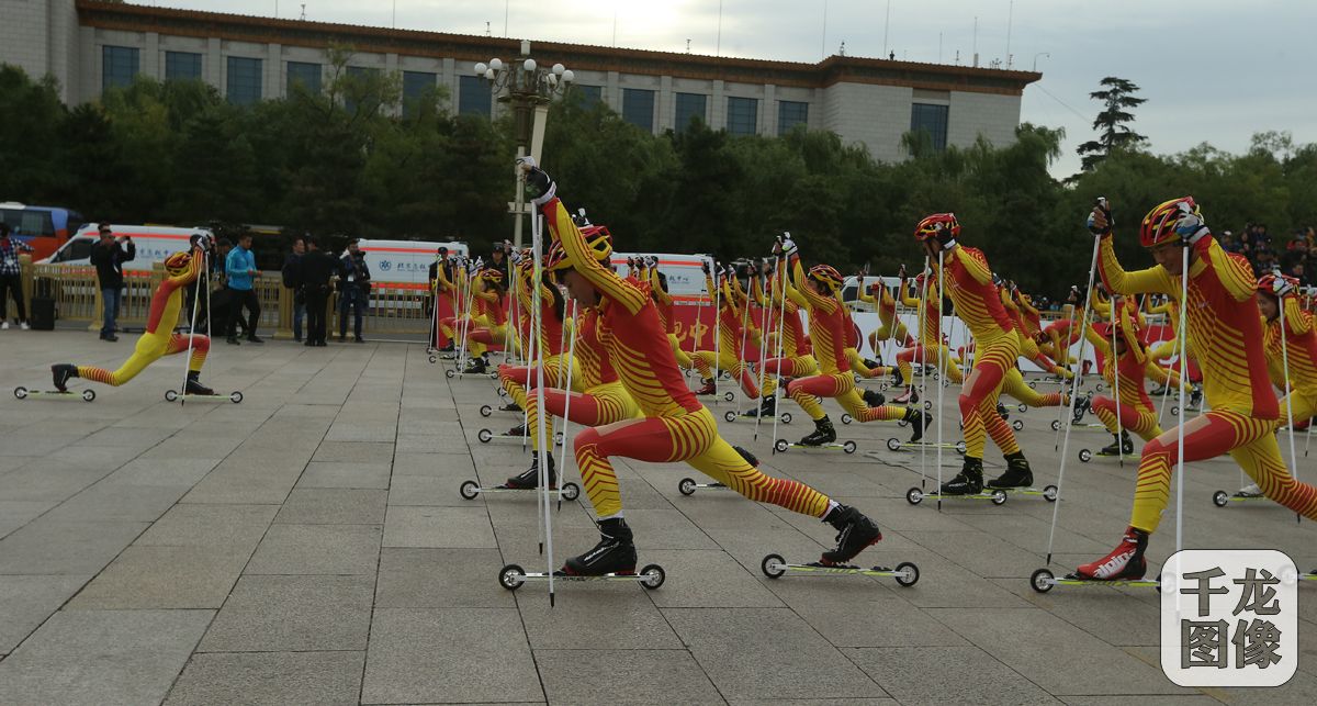 9月16日,2018华夏幸福北京马拉松(以下简称“北马”)在天安门起跑,组委会在起跑仪式现场设置了越野滑雪夏季滑轮展示活动。图为滑轮展示的队伍出发前热身。千龙网记者 戚连民摄