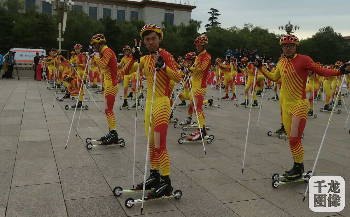 9月16日,2018华夏幸福北京马拉松(以下简称“北马”)在天安门起跑,组委会在起跑仪式现场设置了越野滑雪夏季滑轮展示活动。图为滑轮展示的队伍出发前热身。千龙网记者 戚连民摄