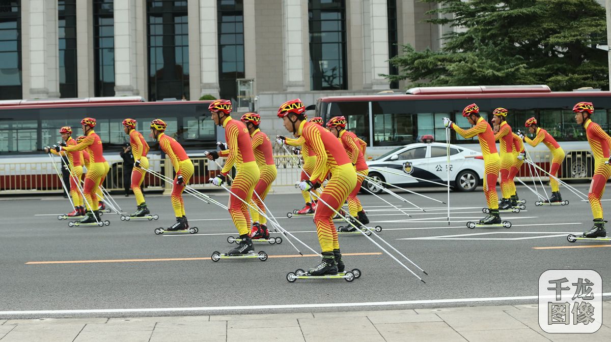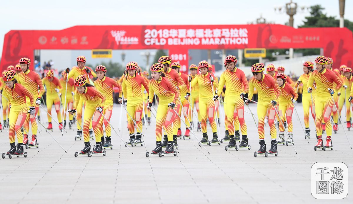 9月16日,2018华夏幸福北京马拉松(以下简称“北马”)在天安门起跑,组委会在起跑仪式现场设置了越野滑雪夏季滑轮展示活动。图为滑轮展示的队伍出发滑向赛道。千龙网记者 戚连民摄