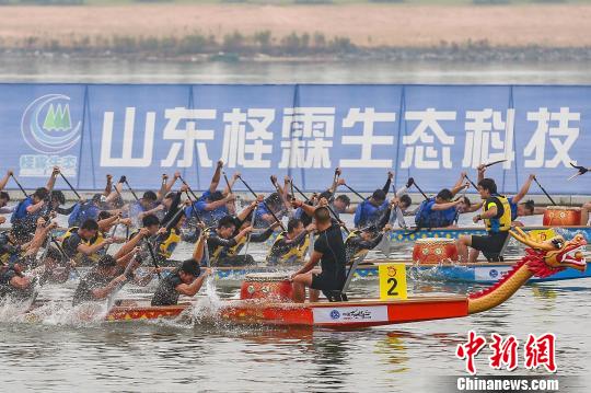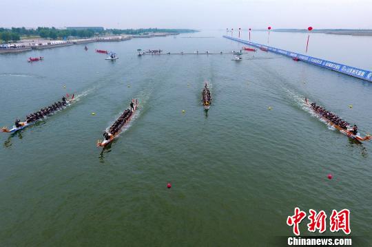 2018中国龙舟公开赛(山东潍坊站)比赛上,各队龙舟你追我赶,争先恐后地冲向终点线。 孙宏瑗 摄