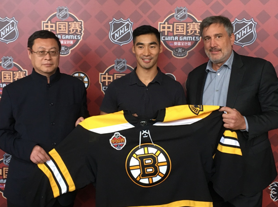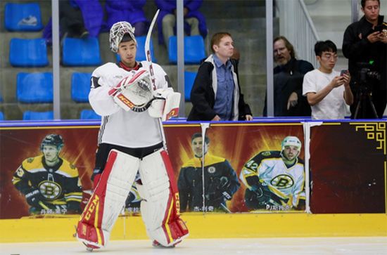 人民网北京9月18日电(管若寒)9月17日下午,在2018奥瑞金·NHL中国赛北京站正式打响的前两天,波士顿棕熊主席Cam Neely率队来到奥众冰场进行赛前训练时正式向媒体宣布,与现效力于昆仑鸿星奥瑞金队的华裔门将段仕能签订试训协议,他将在NHL中国赛北京站比赛中出任棕熊队的第三门将。在宣布这一消息的同时,波士顿棕熊主席Cam Neely在现场一众媒体的见证下向段仕能授予了1号球衣,并与促成此次签约的奥瑞金科技股份有限公司董事长周云杰共同展示球衣。