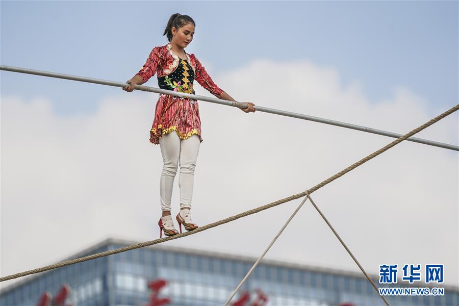 离地20米拉起二指粗细的绳索,没带任何保护措施的努尔曼古丽脚蹬8厘米高跟鞋,手持长竿在绳索上进退自如,引得围观者阵阵惊呼。