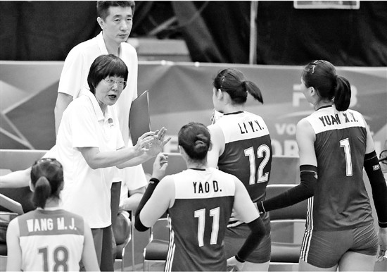 郎平(左二)在与俄罗斯队的比赛间隙指导球员。她的经验与智慧是中国女排的一大优势。新华社发
