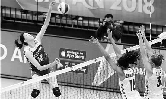 李盈莹(左)在比赛中扣球。新华社发