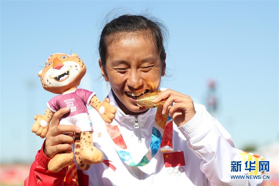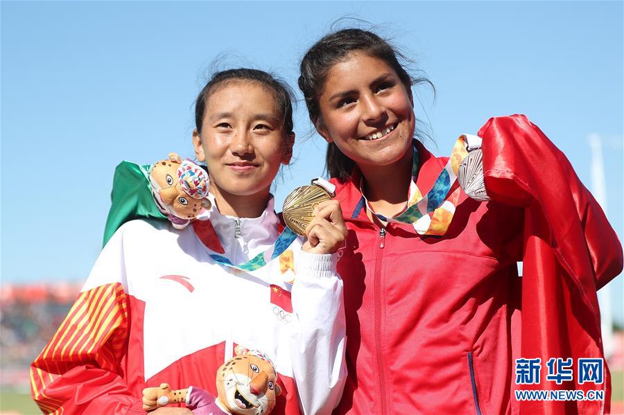 ↑10月16日,中国选手西日措在颁奖仪式上。 当日,在阿根廷布宜诺斯艾利斯举行的第三届夏季青年奥林匹克运动会田径项目女子5000米竞走比赛中,中国选手西日措经过两阶段比赛,成绩相加以45分03秒49的总成绩夺得金牌。 新华社记者李明摄