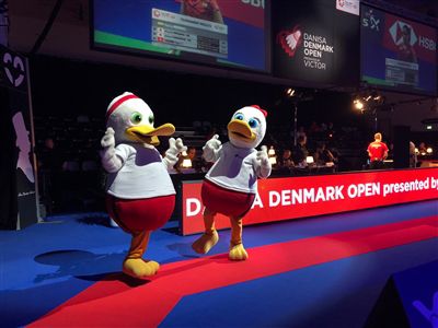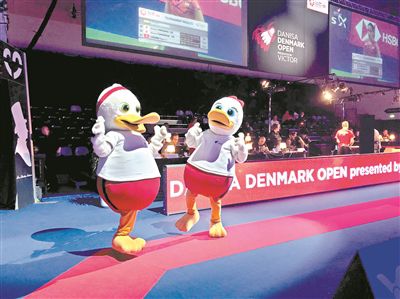丹麦羽毛球公开赛的吉祥物在赛场亮相,造型可爱。
