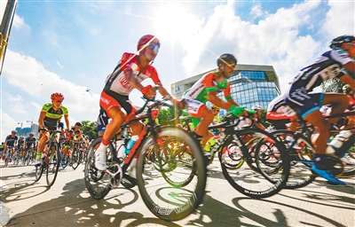 环岛赛参赛车手在第三赛段中顶着烈日骑行。 本报记者 陈元才 摄